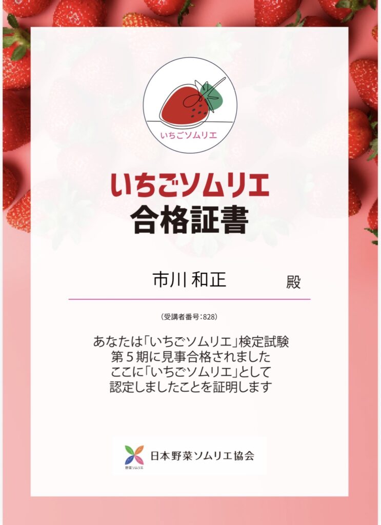 この度、日本野菜ソムリエ協会さまからご案内をいただき、「いちごソムリエ」の資格を取得いたしました。